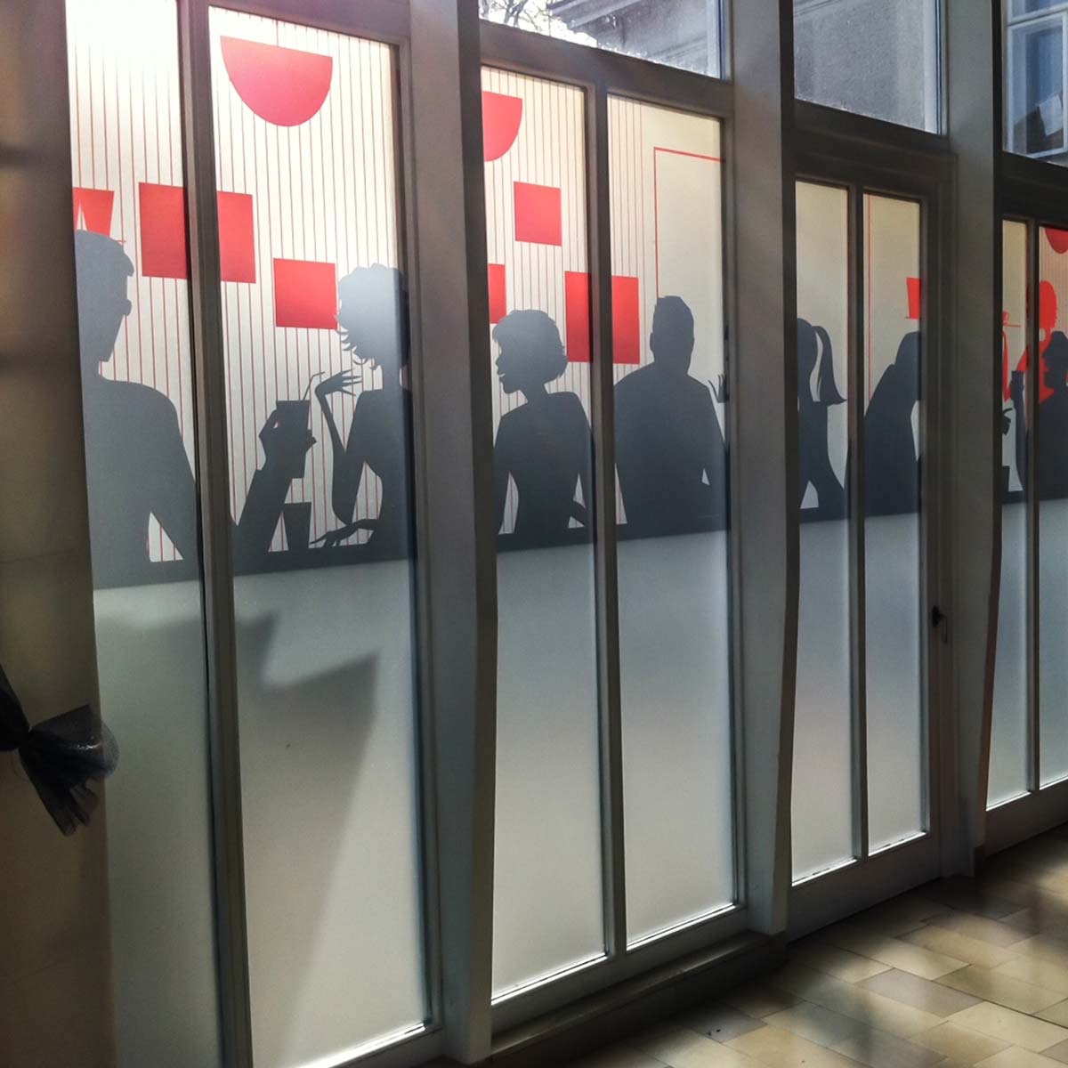 Bedruckte Sandstrahlfolie für die Veredelung von Glasflächen. Kann auch noch Konturgeschnitten werden um besondere Effekte zu erzielen. Auf Wunsch mit mattem Schutzlaminat für erhöhte Kratz- und UV-Beständigkeit.
