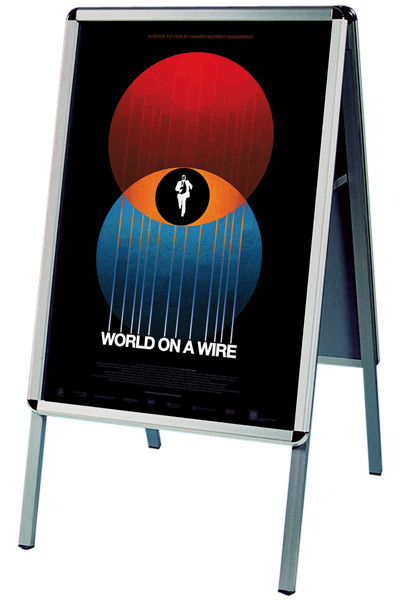 Kundenstopper mit 32 mm Alu Klapp-Rahmen, eloxierter Alu-profil, galvanisierte Stahlrückwand (unlackiert). Rostfrei. Mit entspiegelte APET Frontplatten. Gestell in 15 x 30 mm viereckigem Alu-Rohr. Poster Größe: 84,1x119cm A0Abmessungen: 88,3x140cm Alu - 84,1x119cm A0 - 5999R
