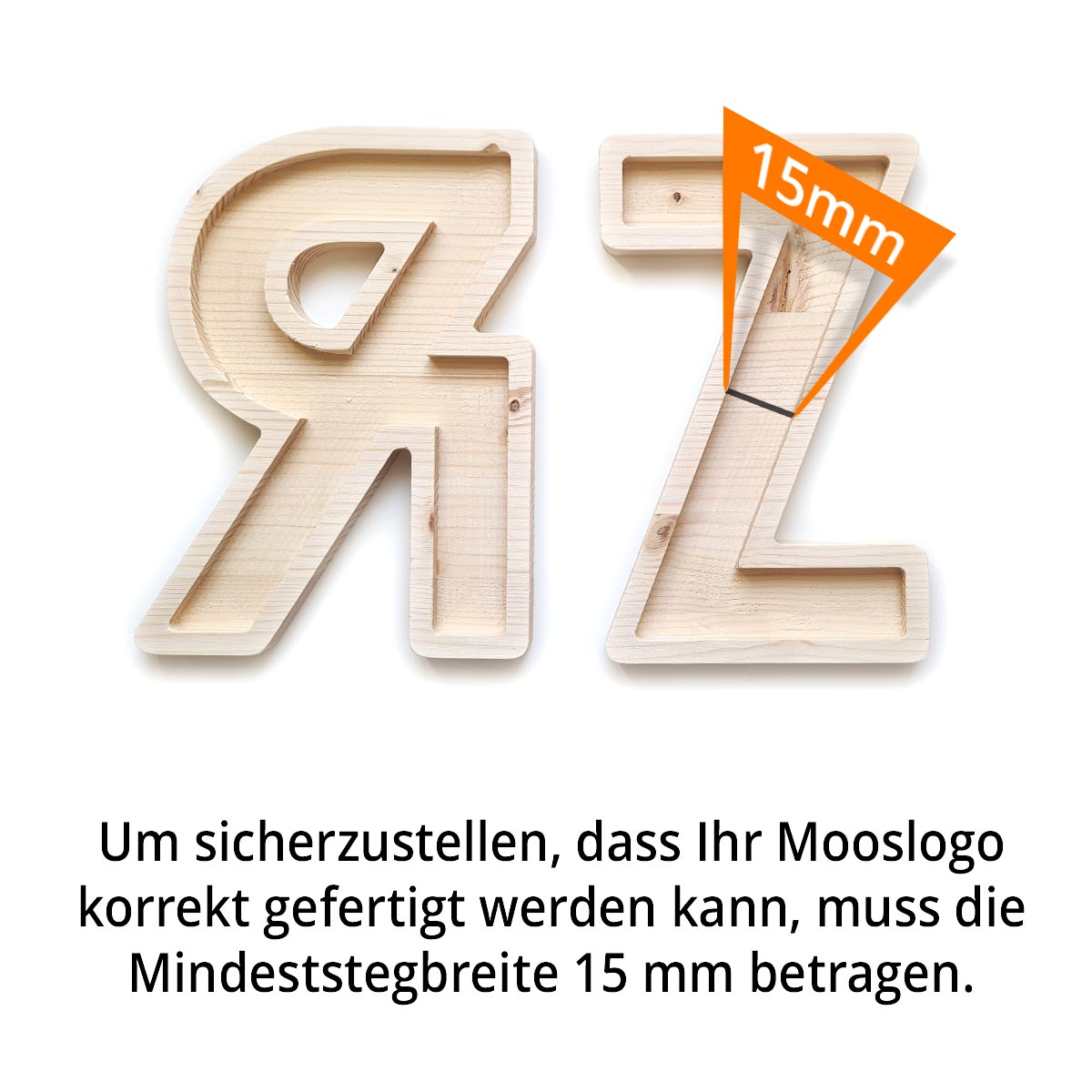 Um sicherzustellen, dass Ihr Moos-Logo korrekt gefertigt werden kann, muss die Mindeststegbreite 15 mm betragen.